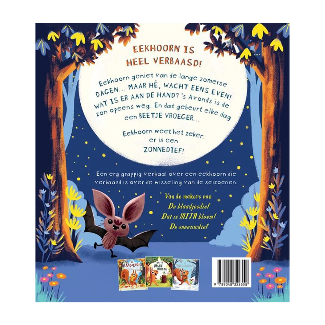 Eekhoorn geniet van de lange zomerse dagen… maar hé, wacht eens even! ’s Avonds is de zon opeens weg, en dat gebeurt elke dag een beetje vroeger. Eekhoorn weet het zeker: er is een zonnedief!