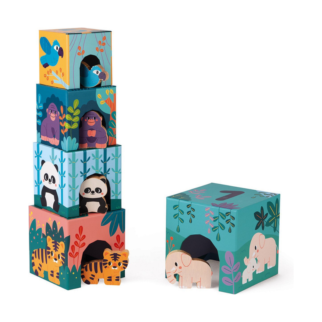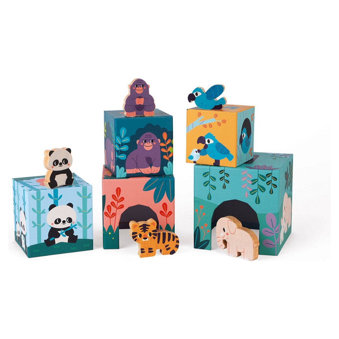Wanneer de toren staat, kunnen kinderen de houten dieren op de juiste plek zetten door ze in de gaten aan de voorkant van de blokken te plaatsen. Het setje bevat een olifant, tijger, panda, orang-oetan en een blauwe ara.