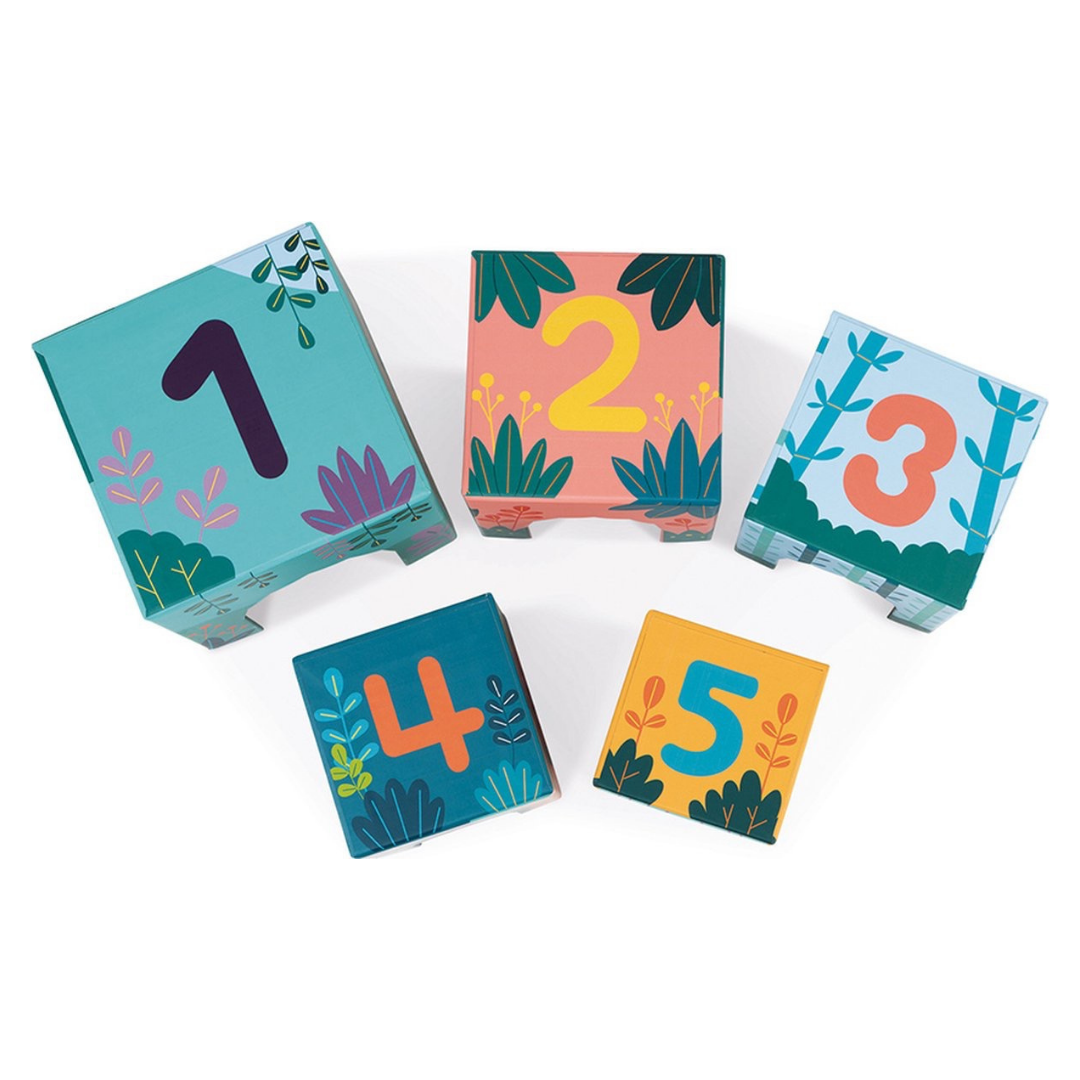Bouw eerst de toren zelf, van het grootste blok tot het kleinste. De grootte van de dieren op de blokken helpt om de volgorde te begrijpen, en de nummers 1 tot 5 maken het ook leuk voor oudere kinderen om vertrouwd te raken met cijfers.